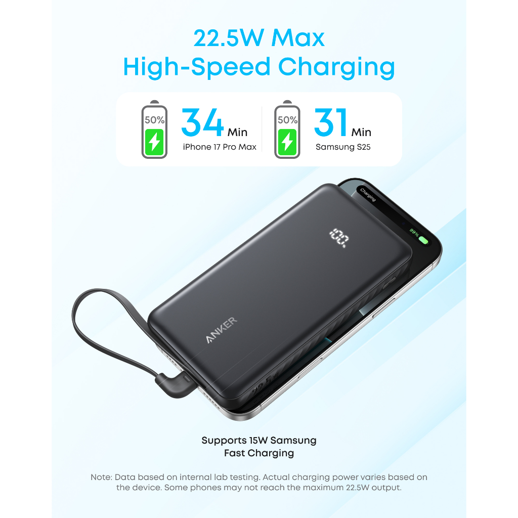 Anker Zolo Portable Power Bank 3C CCC 10,000mAh 3 ports with Built-in Type-C Cable Type-A port 22.5W Fast Charging PD PPS, Pass Through Charging, Compatible for iPhone, Samsung - A110D