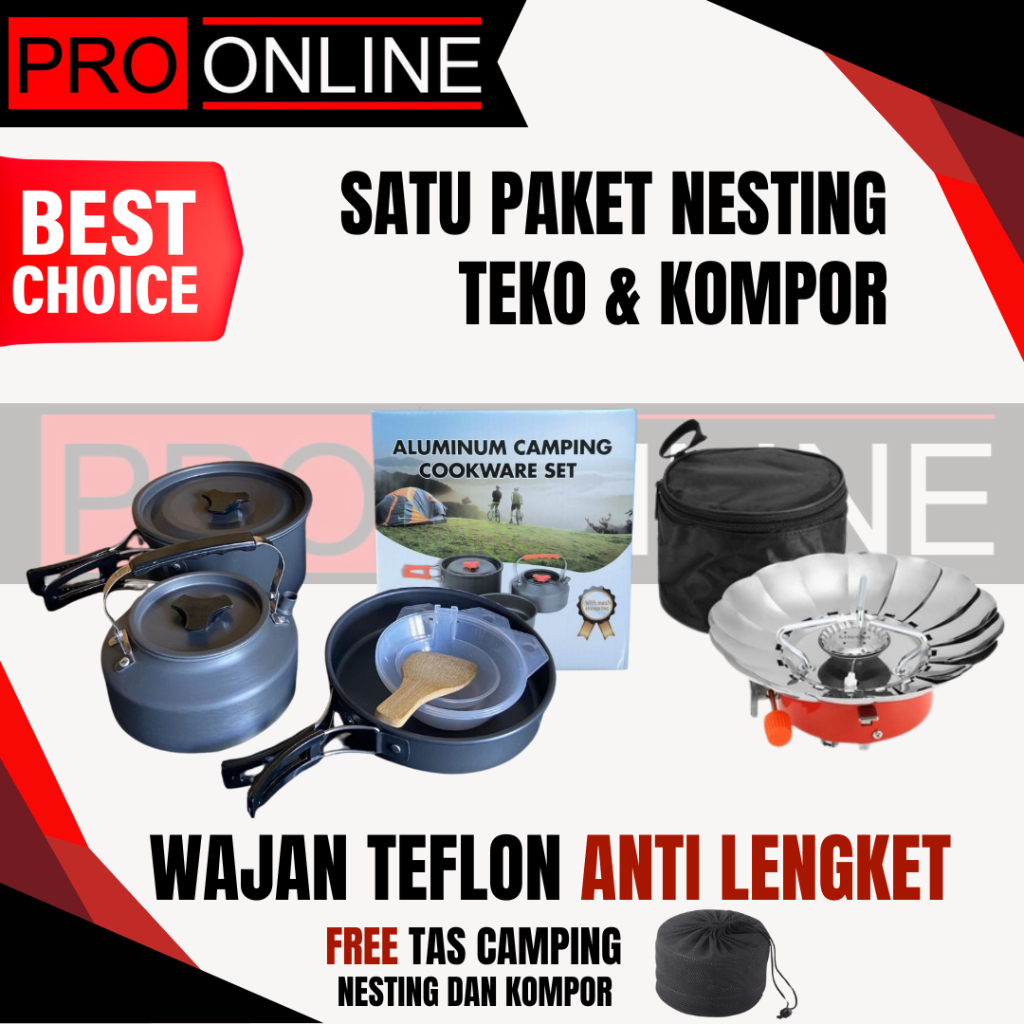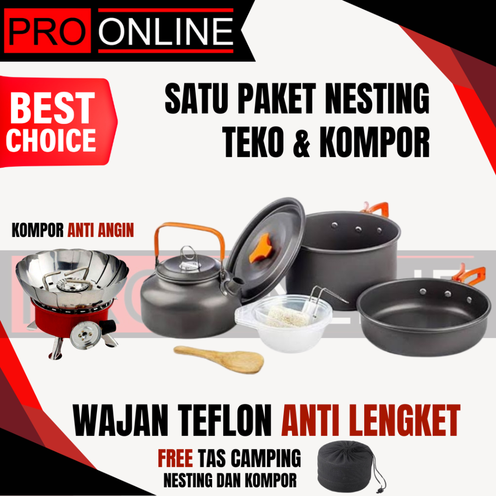 Paket Wajan Teko & Kompor Windproof Kemping Gunung Cooking Set DS308 & Stove K203 Camping Outdoor