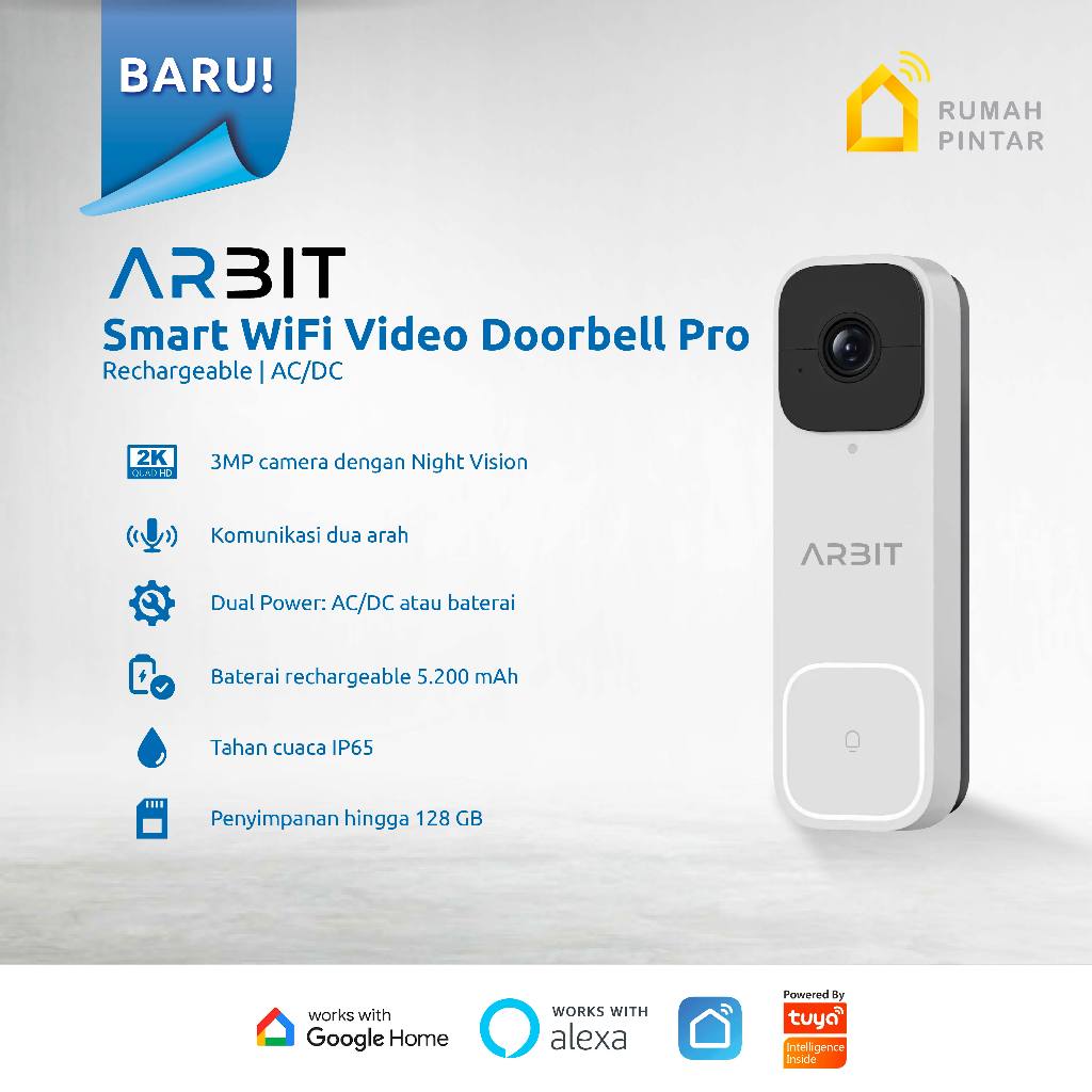 Arbit Wifi Video Doorbell Pintar Waterproof Tahan Air Ip65 3Mp 2048P + Chime + Smart Home Pro White Rechargeable Two Way