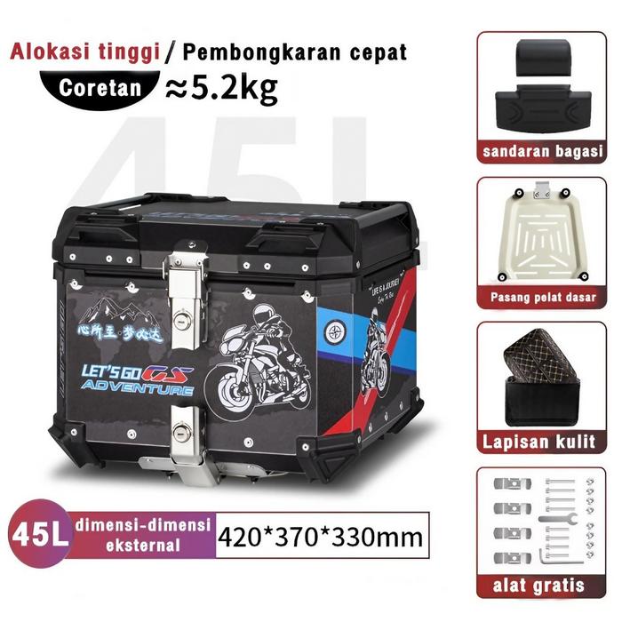 Anchi Kotak Belakang Motor Paduan Aluminium Kapasitas 45L Kunci Pengaman Strip Lampu Reflektif Tahan