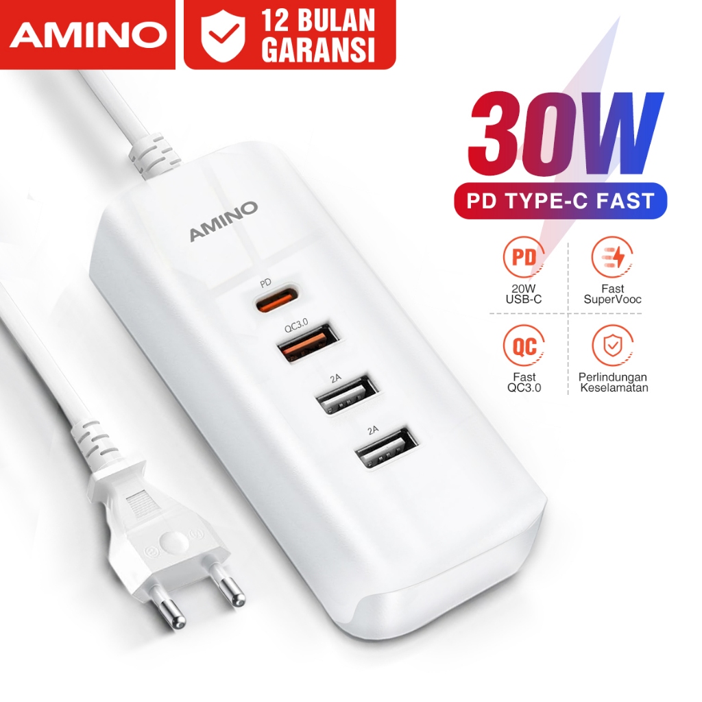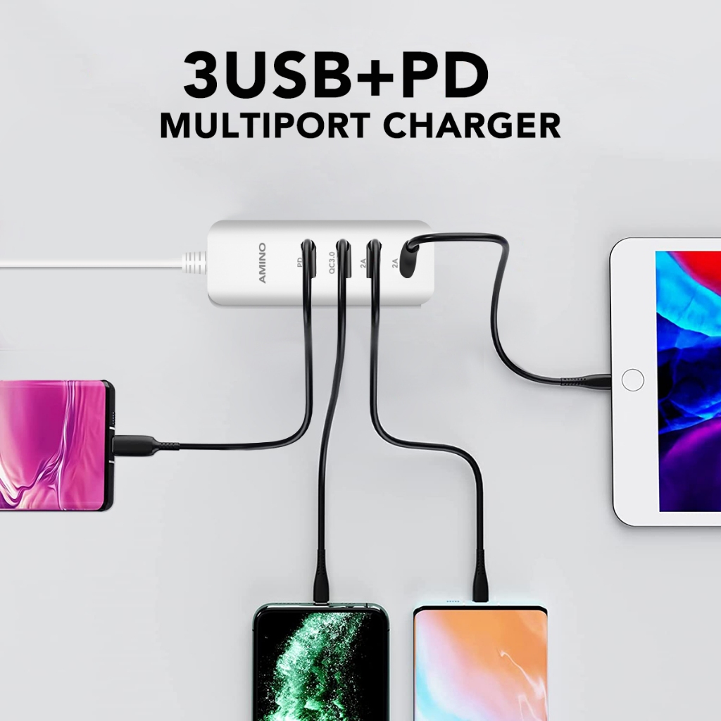 AMINO 30W PD20W SuperVOOC QC3.0 3USB + PD Port 4 IN 1 Multi Port Charger Fast Charger Adaptor LED Function / USB C Port Fast Charger untuk 0P00 samsung xiaomi