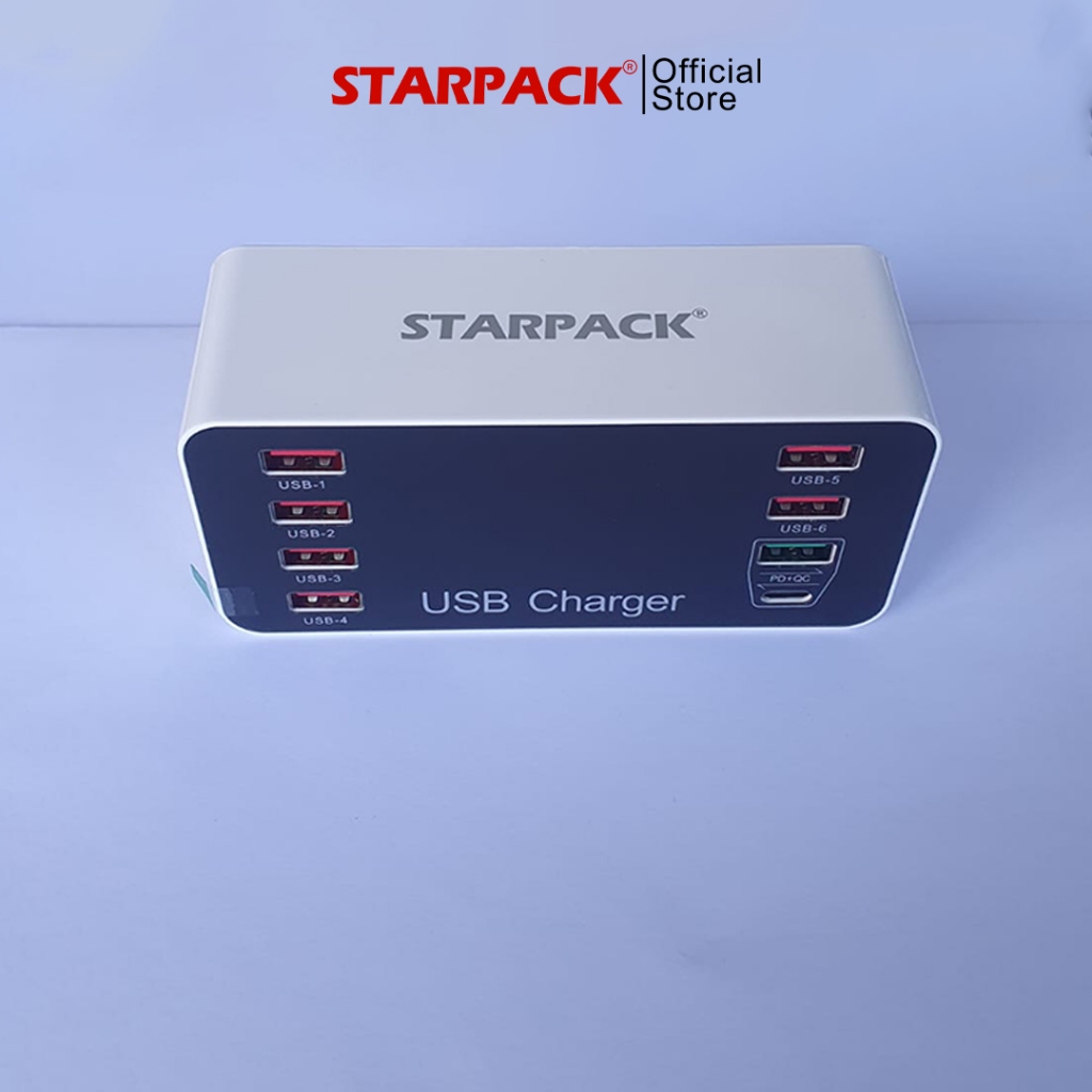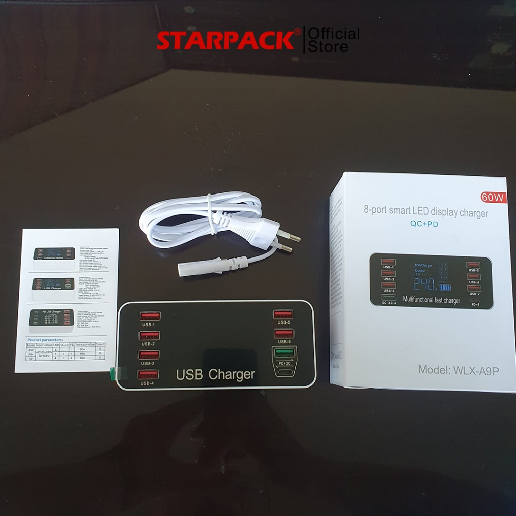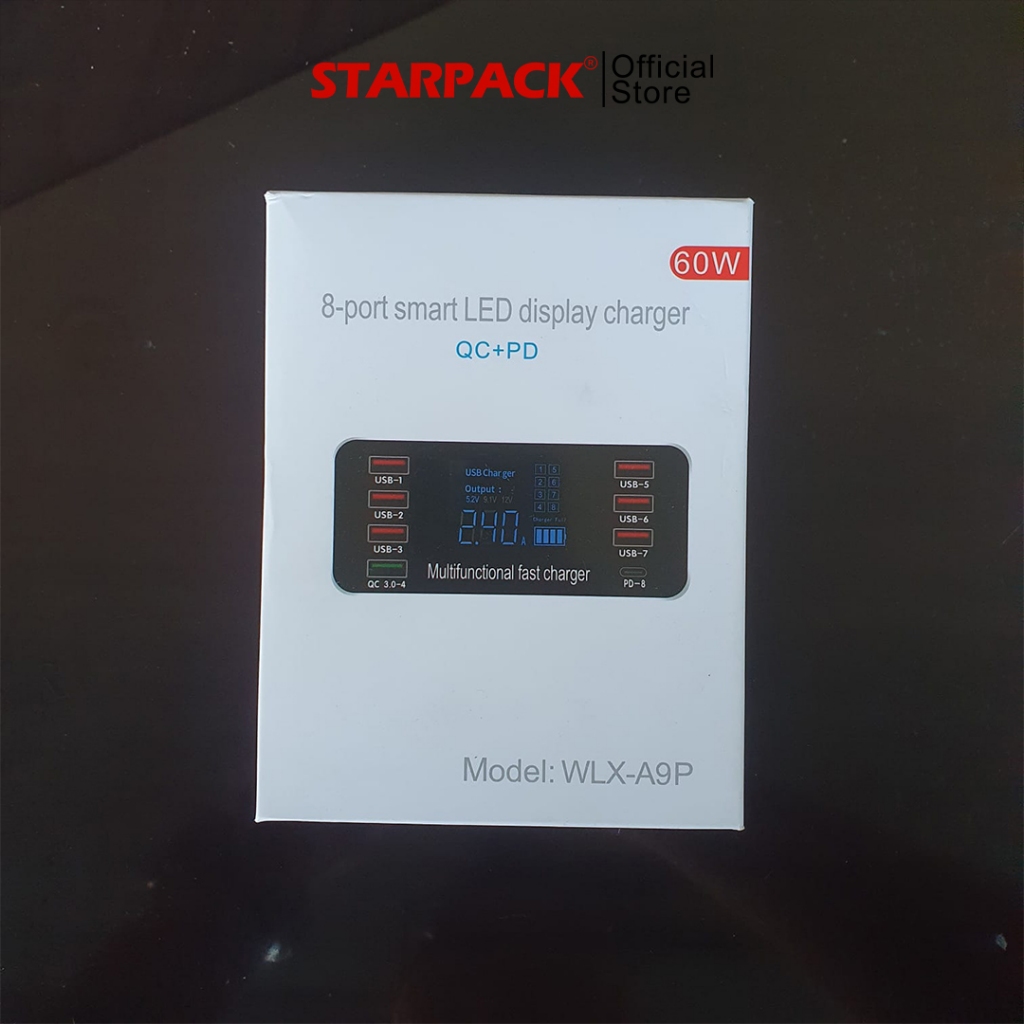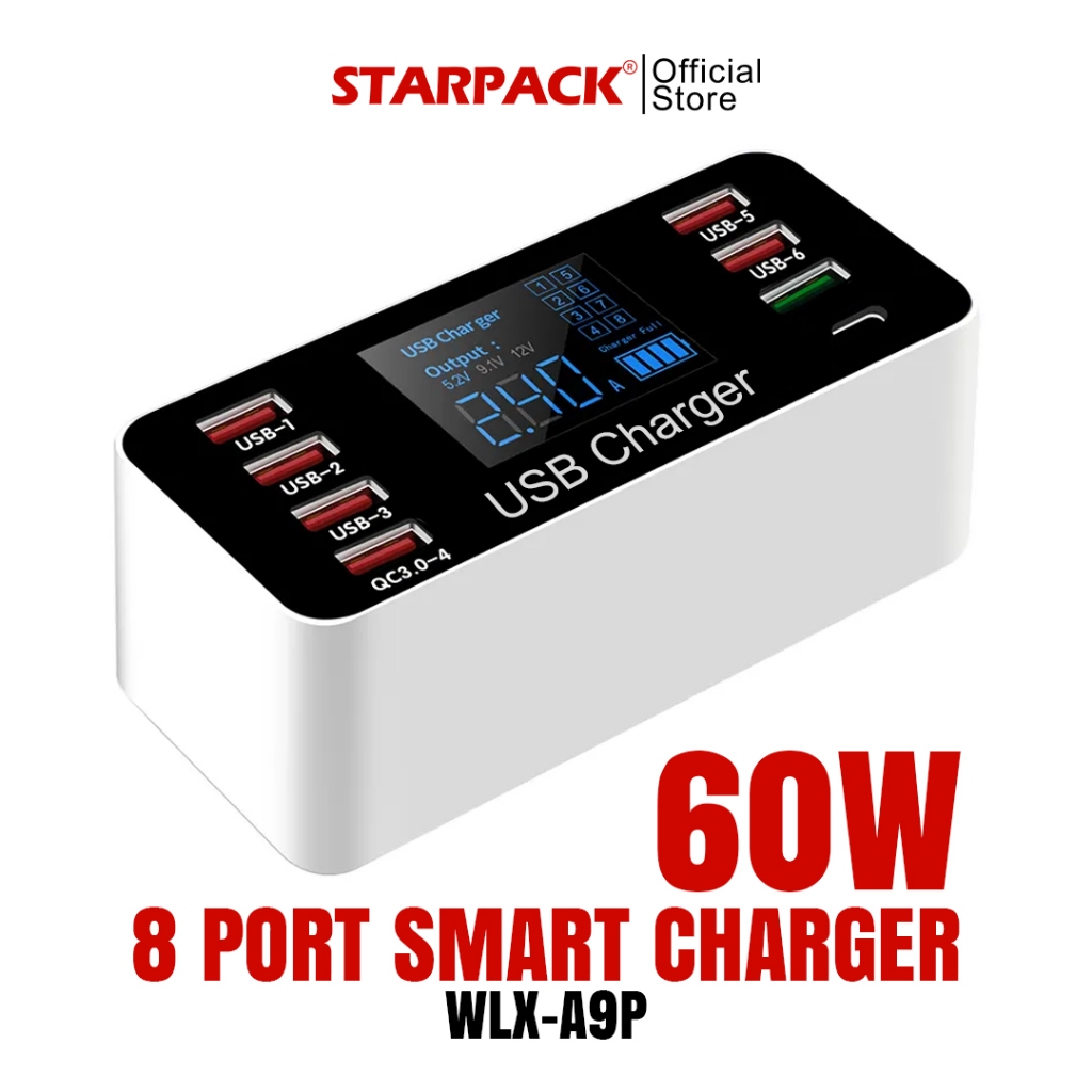 STARPACK Fast Charging 8 USB Port Smart LED Display Charger | Tablet/Ponsel 60W Pengisi Daya Cepat - With Type C