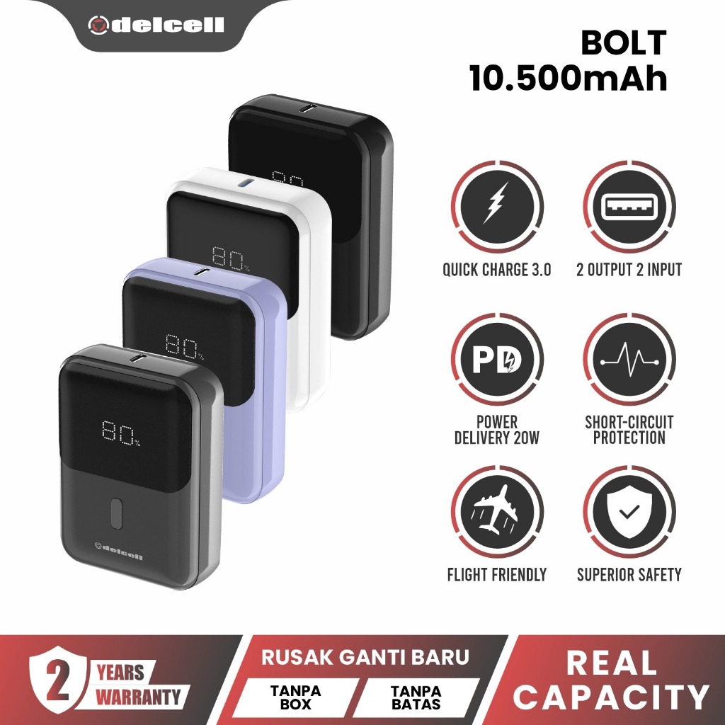 Delcell Bolt Powerbank Mini 10500mAh Fast Charging 22.5W Digital Display QC + PD 2 Tahun garansi