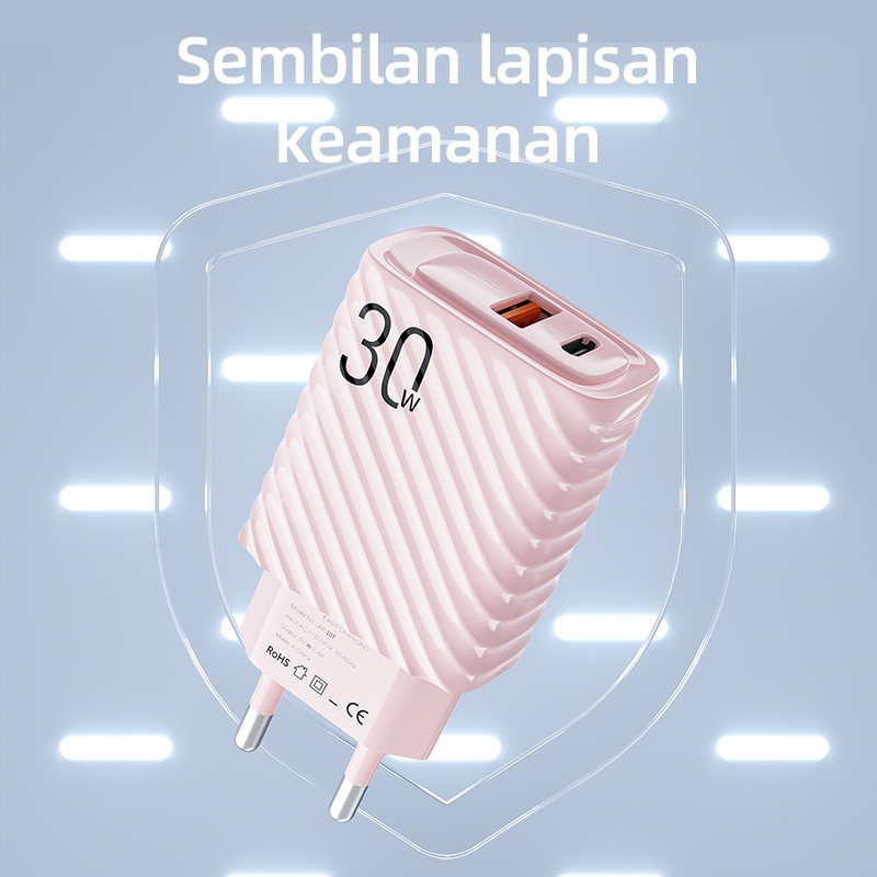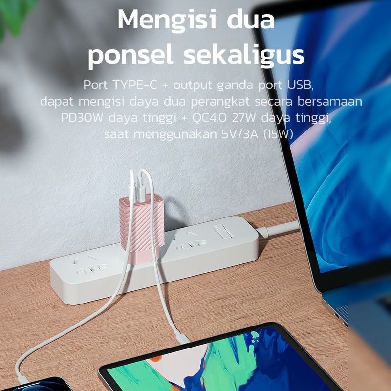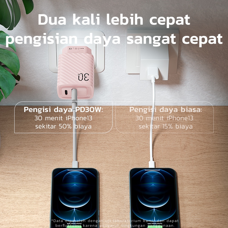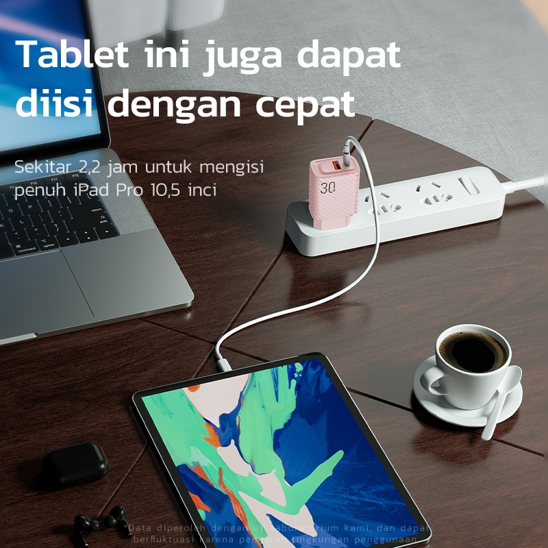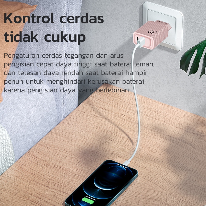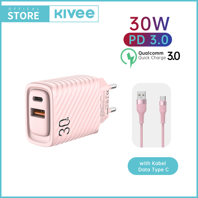 (HOT) KIVEE Charger Type C Fast Charging 30w KV-AC107 Pink & Kabel Data USB To Type C Set Quick 4.0