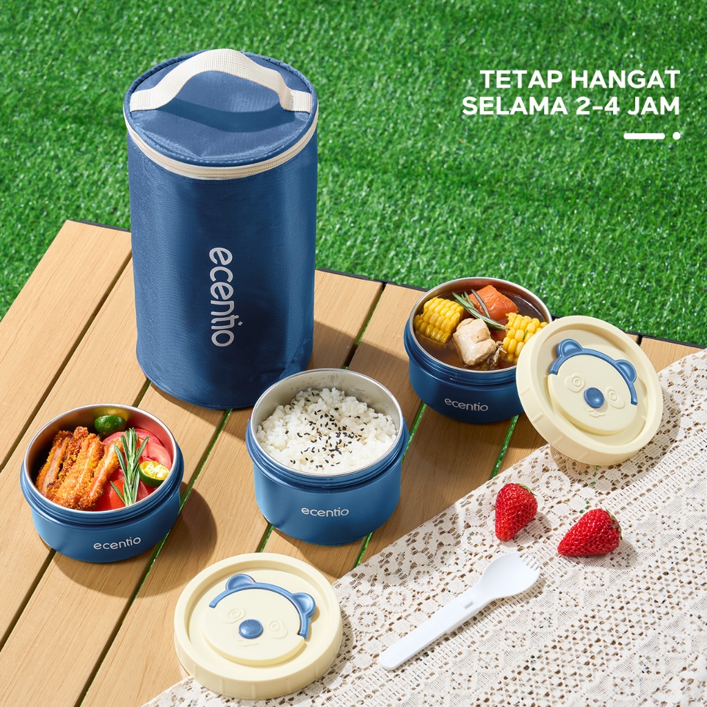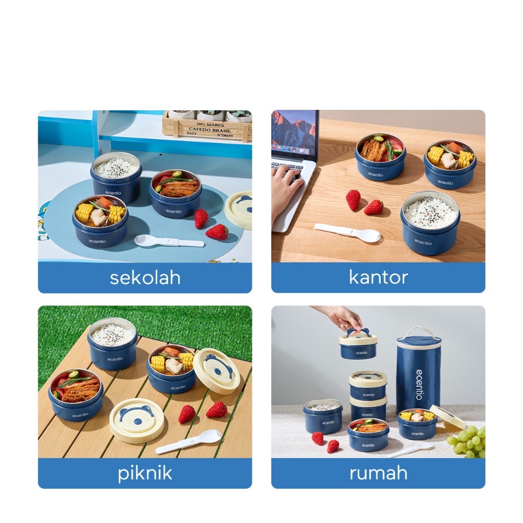 ecentio lunch box tas set 3pcs Biru Makan anti tumpah 304 Stainless Steel tas bekal dan free sendok Murah Gratis Ongkir