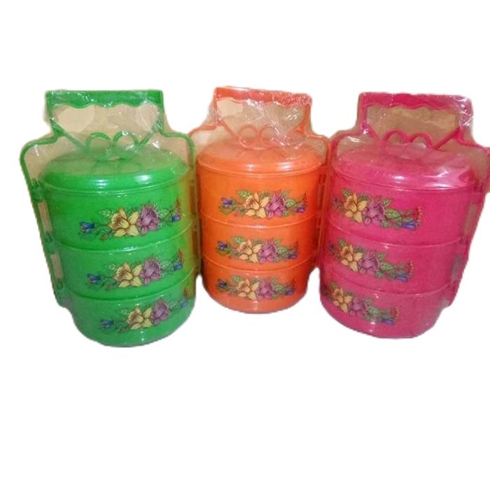 Rantang Bulat Susun 3 Moge Pasifik - Warna Hijau Oranye dan Pink dengan Desain Bunga Kitchenware