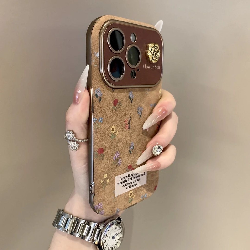 Luxury Desert Gold Large Window Full Screen Small Floral Mobile Phone Case for iPhone16 15 14 13 12 11 Pro Max Shockproof Camera Protection Drop-proof Soft Back Cover