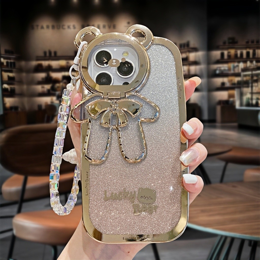 Glitter Bear Phone Case for iPhone 14 15 ProMax 13 12 11 Pro Max 7 8 Plus Xr Xs Max Colored Bracelet Bear Ears Shockproof Cover With Lens Camera Protection