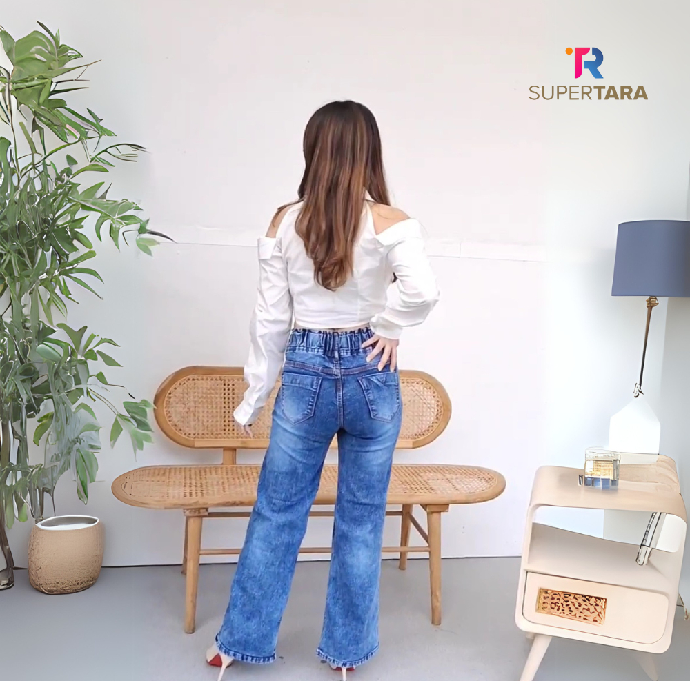 Supertara celana jeans wanita kulot pinggang karet