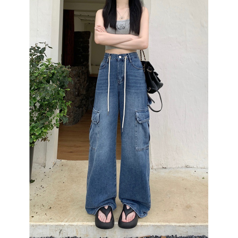 Celana Panjang Jeans Cargo Premium HW Wanita Kulot /Celana Kerja / Motif Tali [ 860 -J072 ]
