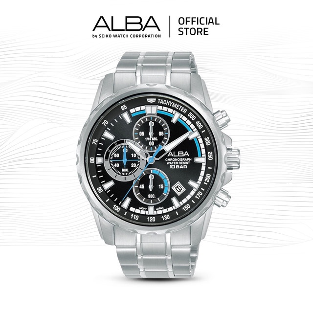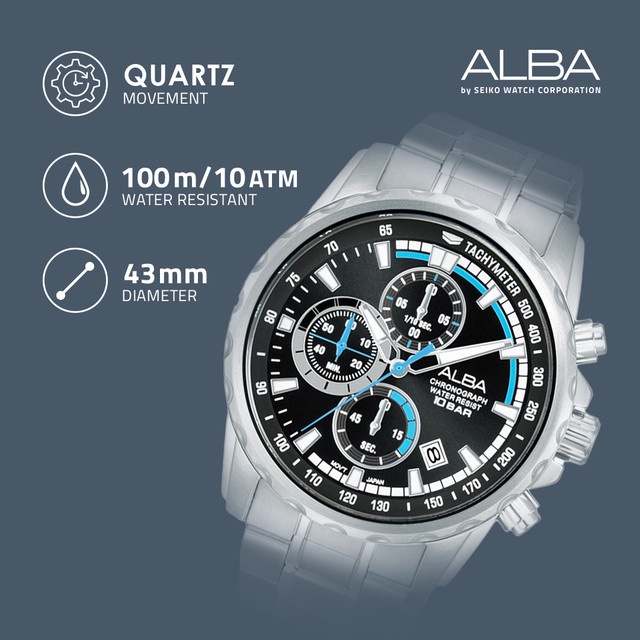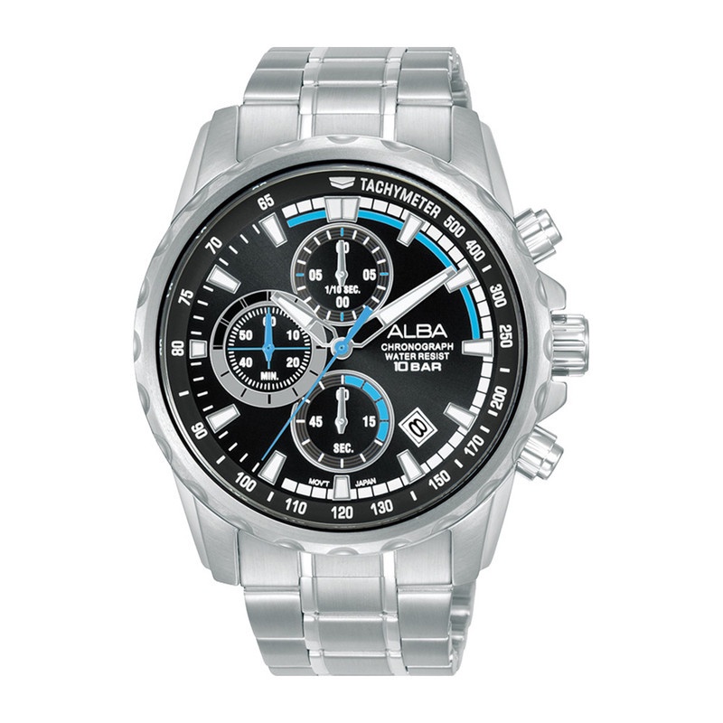 Alba Active Jam Tangan Pria Chronograpth AM3933 / AM3933X1 Quartz Black Blue Ice Dial Stainless Steel Strap Watch