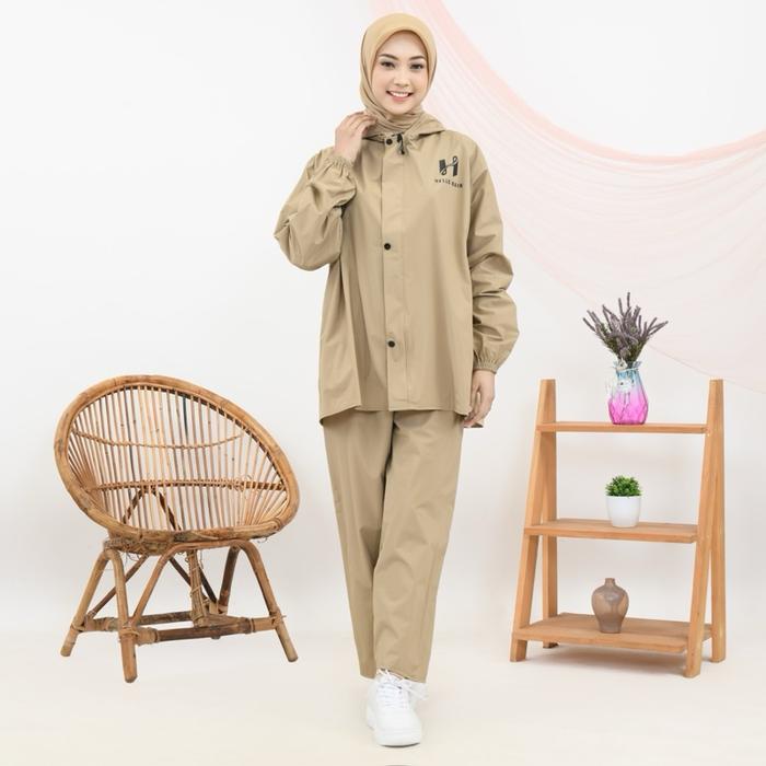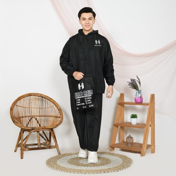 JAS HUJAN Setelan Pria Wanita by HELLORAIN Bahan PVC Tebal Elastis Anti Rembes Mantel Hitam Cream