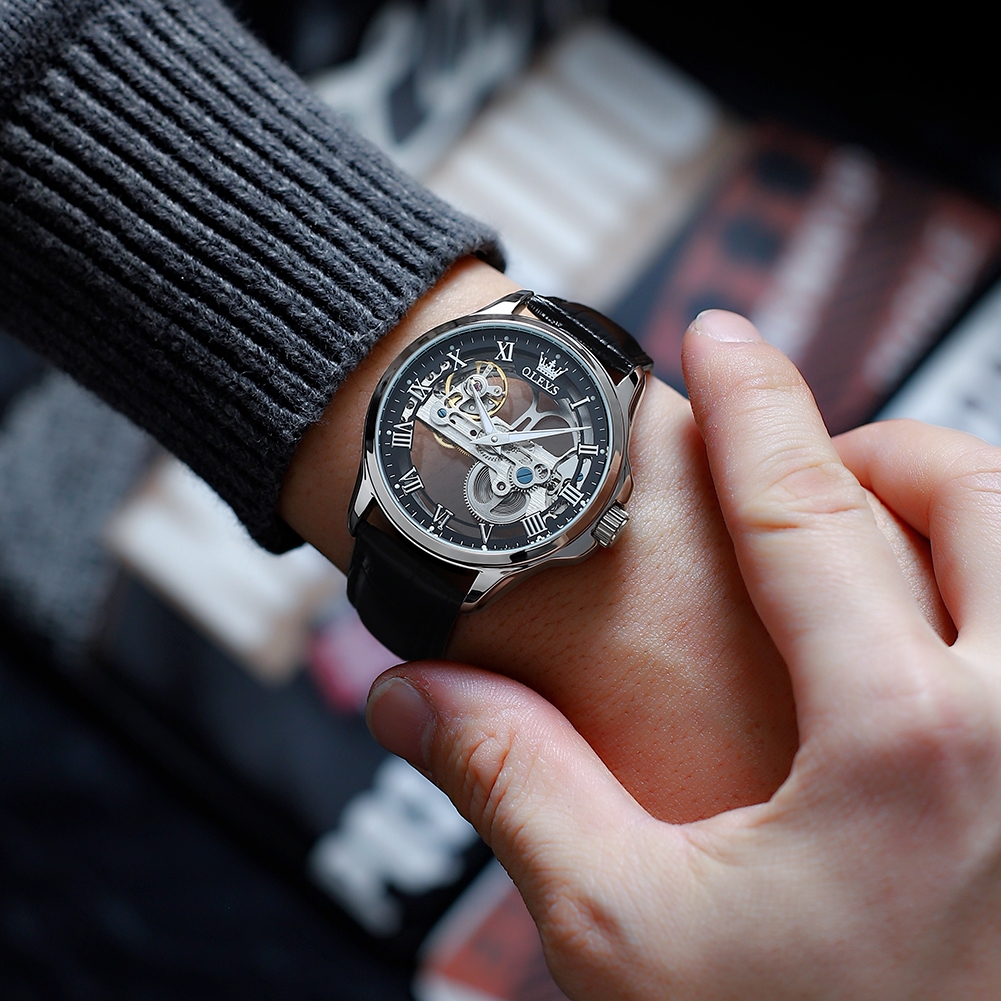 OLEVS Jam Tangan Automatic Pria Original Anti Air Kulit Tahan Keren Led Hitam Biru Putih Luxury Men Watch