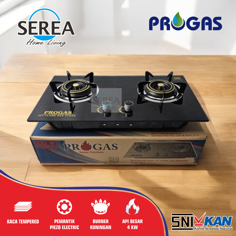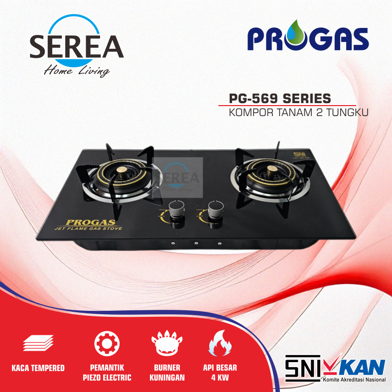 PROGAS Kompor Gas Tanam 2 Tungku PG-569 Kaca Hitam, Bunga Merah SNI Garansi 1 Tahun Api Biru Besar
