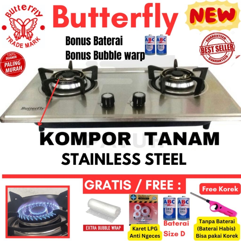 Kompor Tanam Stainless Premium Butterfly Free Batrai Dan Karet Regulator