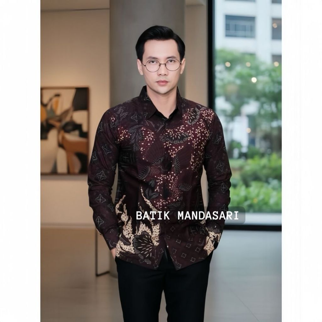 Kemeja Batik Pria Slimfit Lapis Furing Katun Premium Lengan Panjang Wilutama Dark Maroon