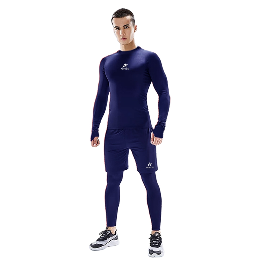 AURION Setelan Baselayer Lengan Panjang Celana Pendek Olahraga dan Manset Legging Pria Wanita