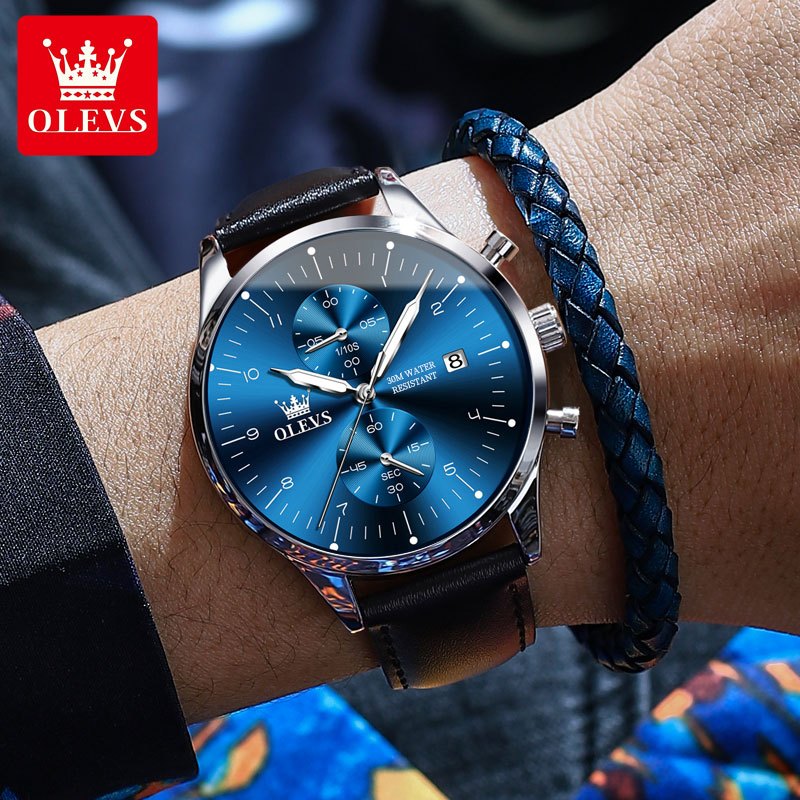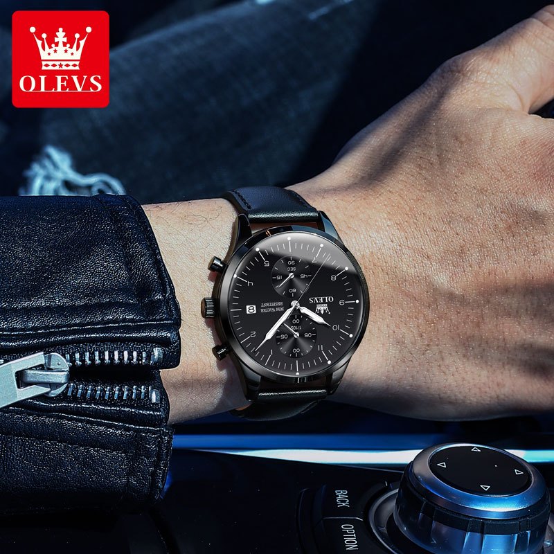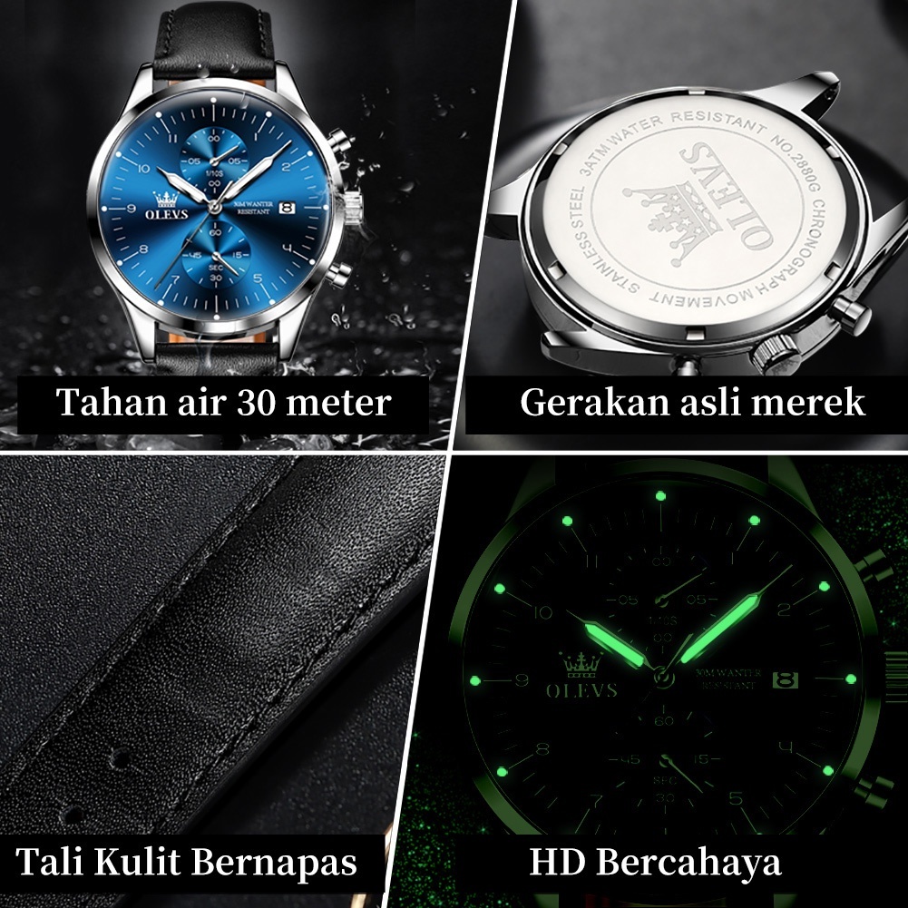 OLEVS Jam Tangan Pria Original Anti Air Kulit Hitam Luxury Chronograph Multifungsi Watch Men 2880