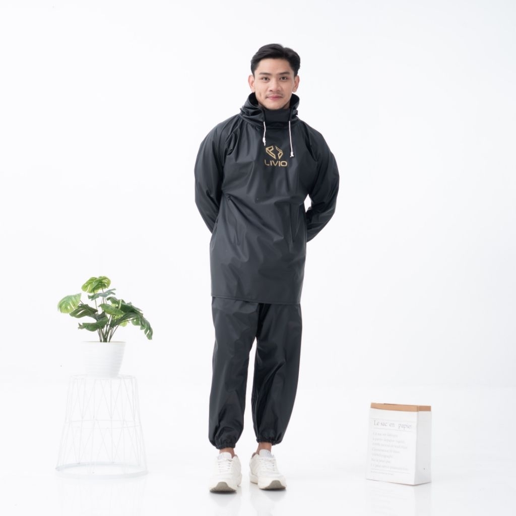 Livio Jas Hujan Raincoat Setelan Pria Cowok Dewas Model Hoodie Jogger Full Sealing Press Bahan PVC 0,25 Tebal Elastis Anti Rembes