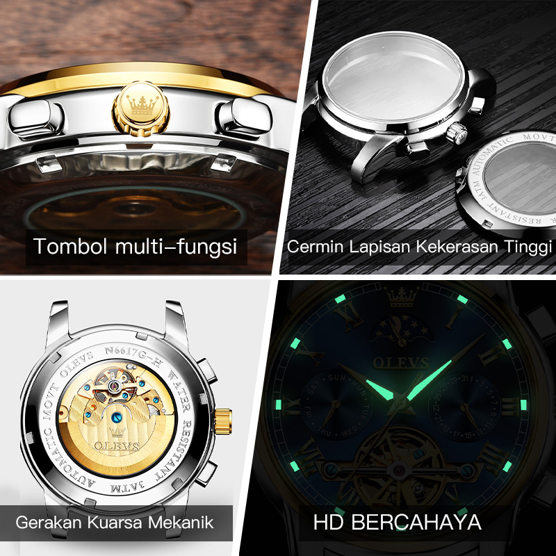 OLEVS Jam Tangan Automatic Pria Anti Air Original Tahan Keren Led Terbaru Luxury Chronograph Stainless Watch Men Biru Hitam Putih Kotak Indah Gratis