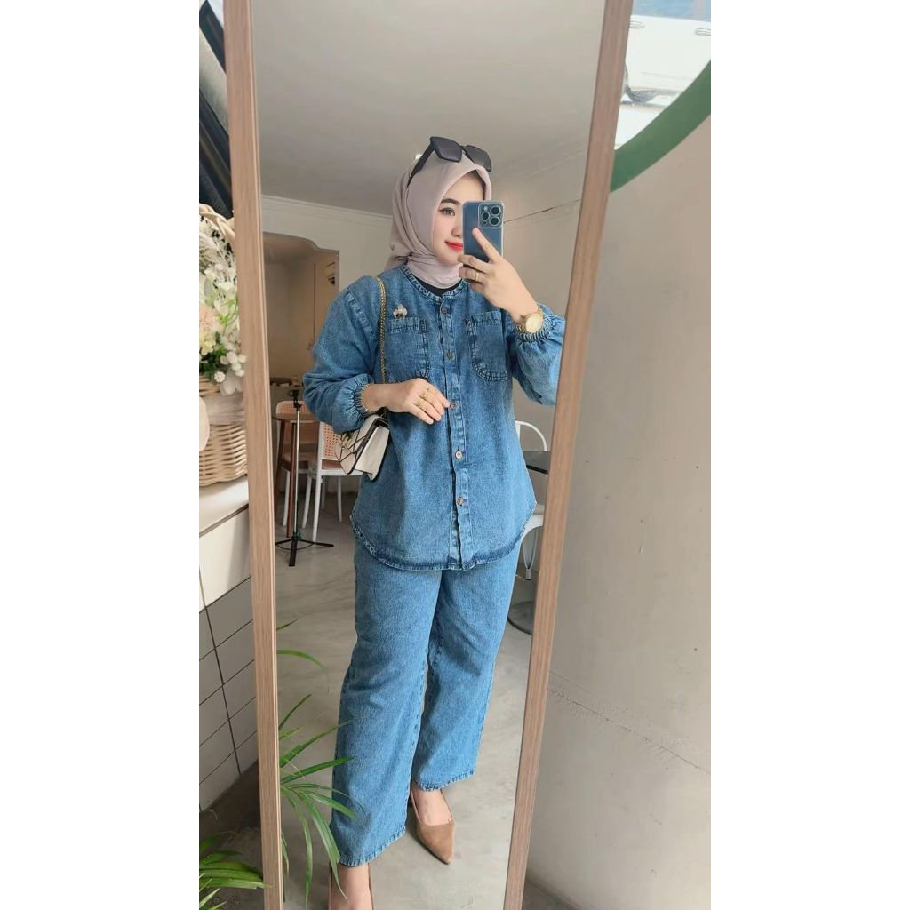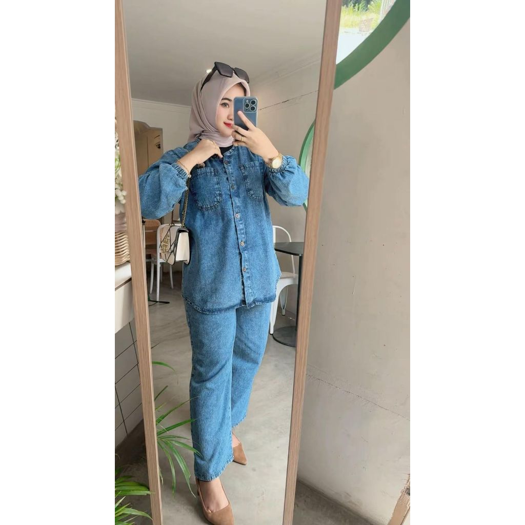 ZifanaAlmeera Setelan Jeans wash Atasan dan Celana Terbaru Jumbo Kekinian Setelan Wanita