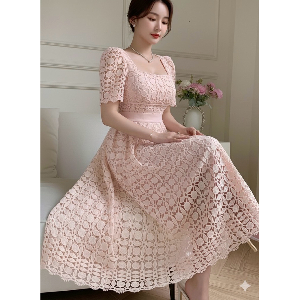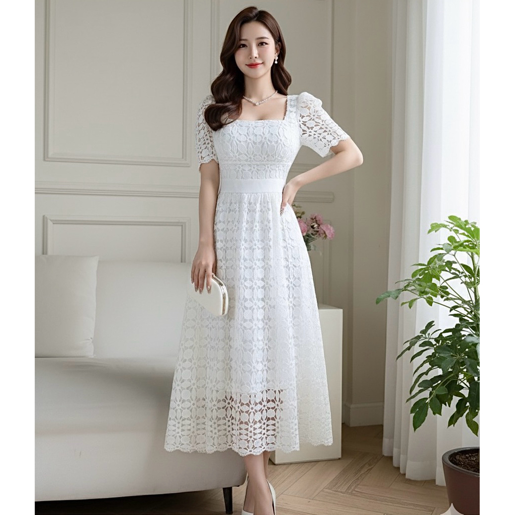 [ADA SIZE JUMBO] D1770 KIGAYOUNG KOREAN STYLE BROCADE CROCHET VINTAGE MIDI DRESS NATAL PESTA ELEGAN