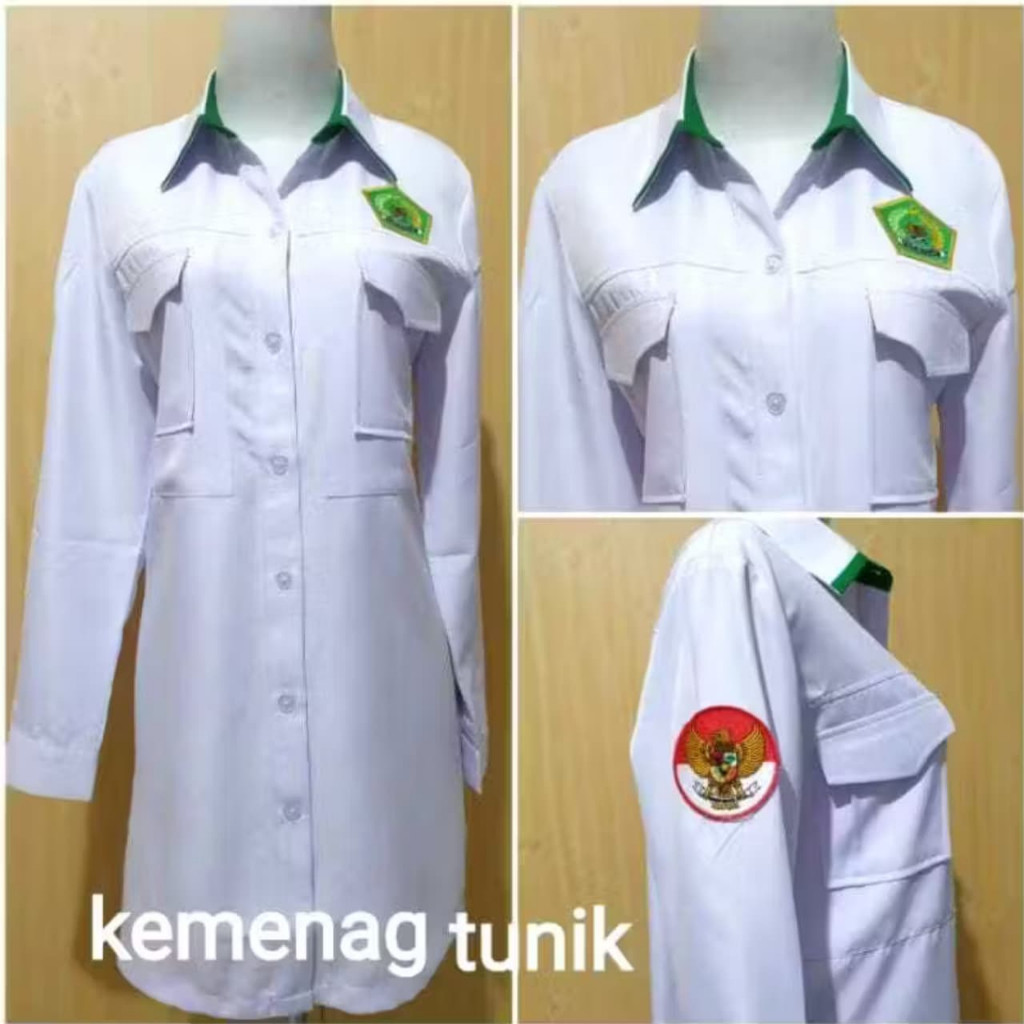 TUNIK PDH KEMENAG PUTIH WANITA LENGAN PANJANG TERBARU 2025 / TERBARU SOP PEMERINTAH / BAJU WANITA ASN PUTIH / KEMEJA WANITA PUTIH LENGAN PANJANG LIST HIJAU FREE CUSTUM NAMA