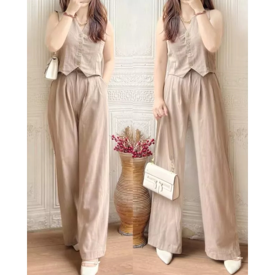 Revlyn One Set Linen Premium With Long Pants One Set Kekinian One Set Vest Stelan Celana Kulot