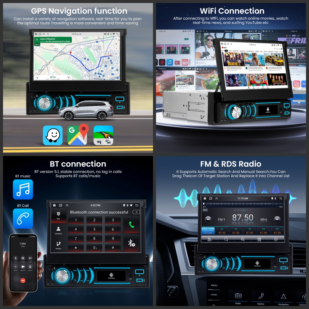 Headunit GEARELEC Single DIN Android 14 4+32G dengan Layar Retractable 7 inci Mendukung WIFI/GPS/Carplay