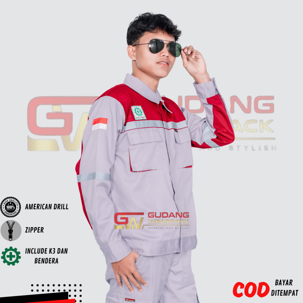 Wearpack Atasan Lengan Panjang Baju Kerja warna Abu Muda kombinasi Merah Maroon