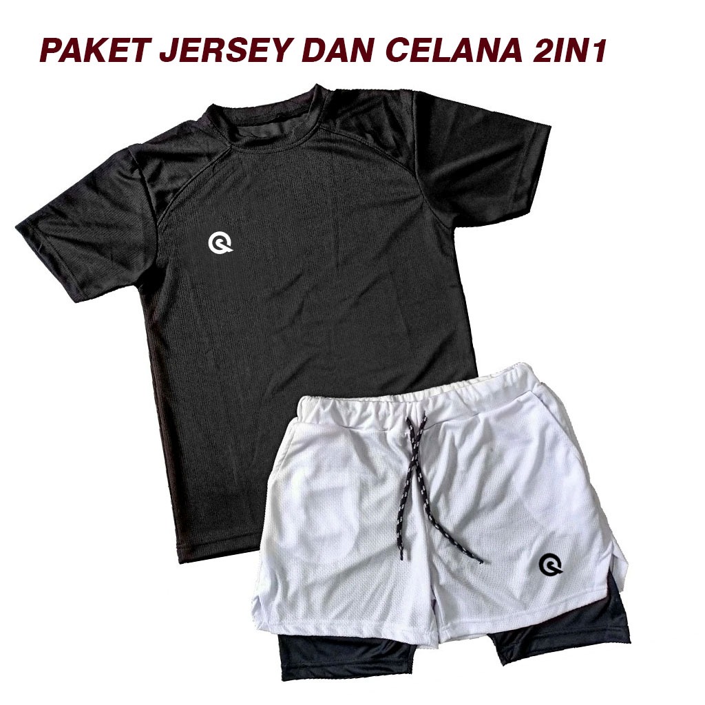Setelan Olahraga Pria Double Layer 1 Set Baju Jersey Kaos Dryfit Celana Pakaian Outdoor Running gym lari Badminton Volly Futsal QIAT Pria Wanita