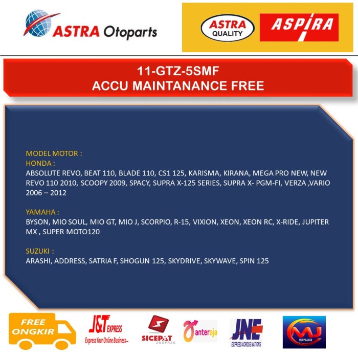 Aki ASPIRA GTZ5S MF(3.5 Ah)-Aki Motor Beat,Mio,Scoopy,Vixion,Xride,dll