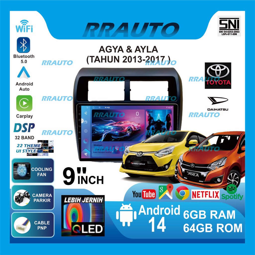 Headunit Agya Ayla 2013-2022 | 6+64gb RAM ROM,QLED,Android 14,Apple Carplay,AndroidAuto Wireless,Wifi,bluetooth,DSP,Tmbol stir,Headunit Tape mobil terbaik 2025 (Bonus Kamera Parkir AHD & Socket PNP)