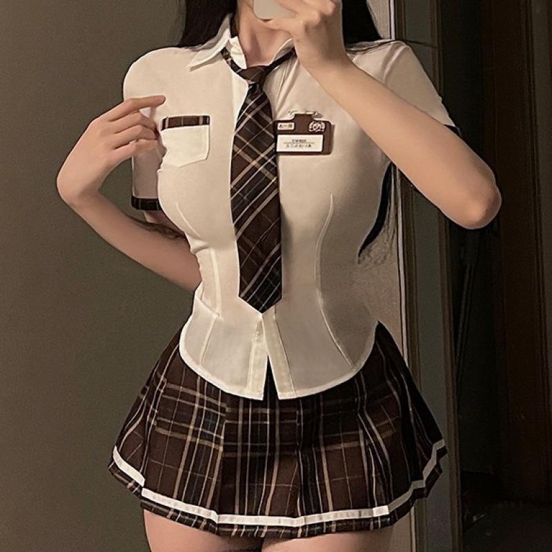 Ukuran Besar Bonus Dasi Set Dua Rok Motif Kotak Coklat Seragam Sekolah Cos