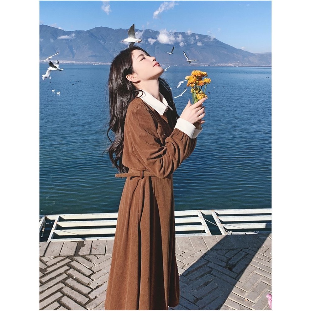 Gaun Korduroi Dua Potong Palsu Retro Prancis Gaun Ramping Dan Elegan