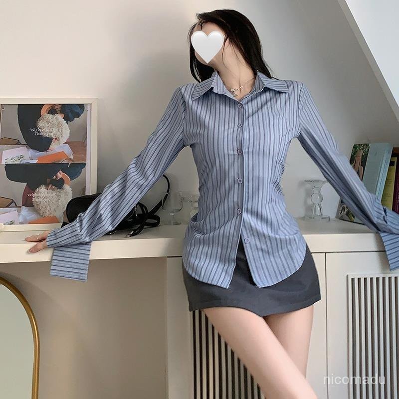 Kemeja Lengan Panjang Bergaris Biru Wanita/Atasan Baju Kemeja Wanita Korean Style