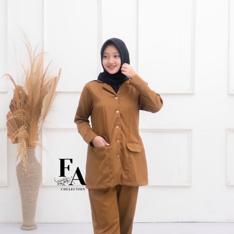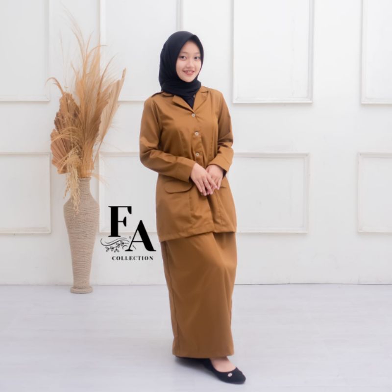 Seragam PNS Khaki Tua Baju Pemda Wanita Terbaru Model Saku Bawah Setelan seragam guru PNS