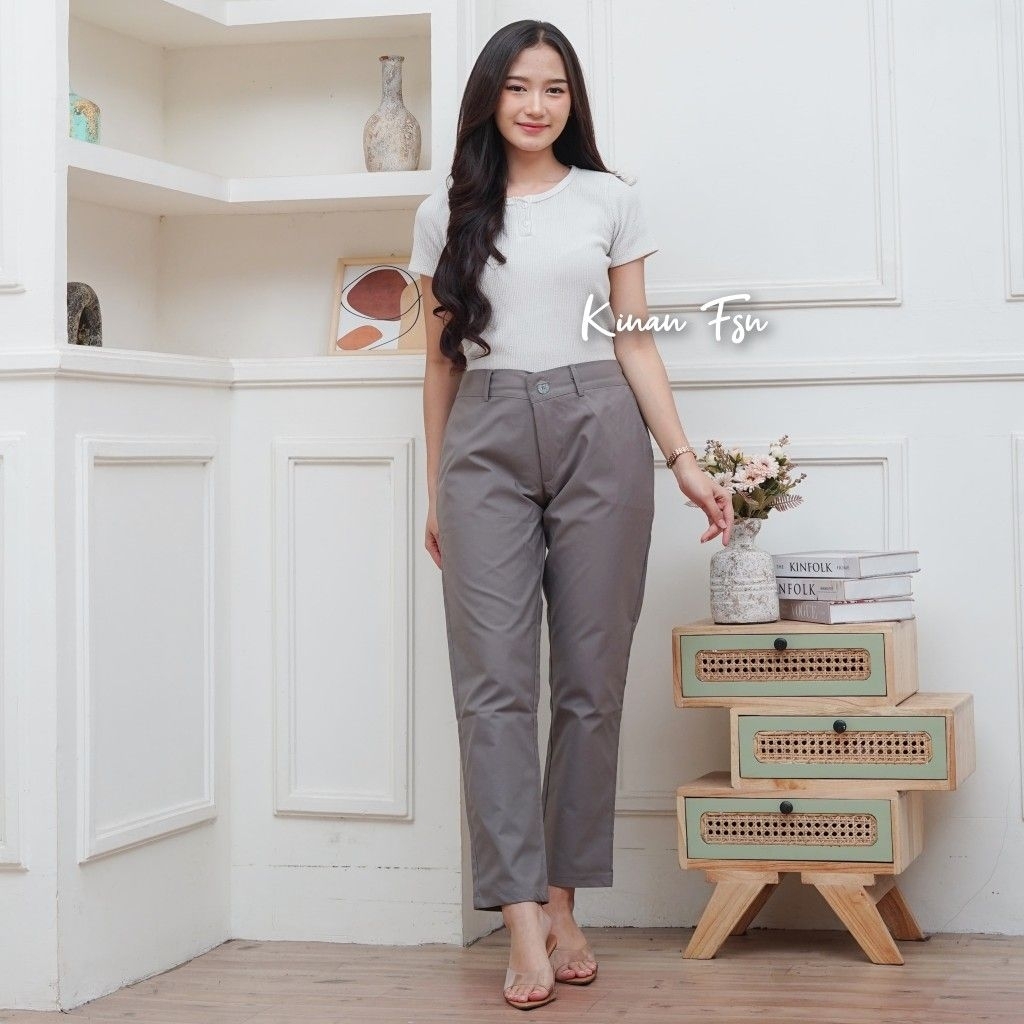 Celana Basic Resleting Wanita Karet Casual Formal Kantor Bahan Katun Jumbo