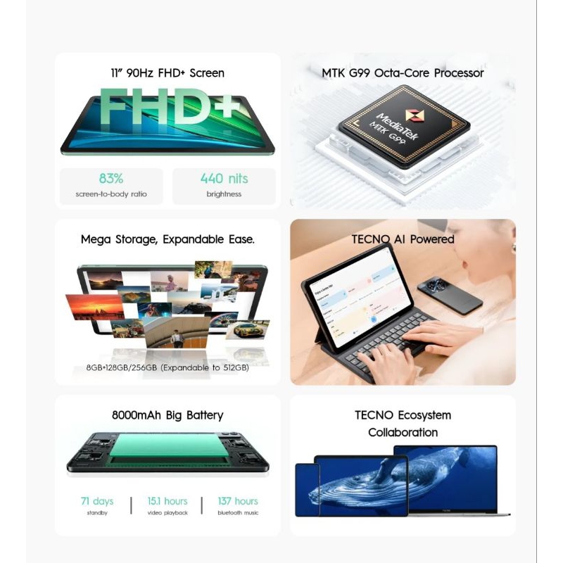 TECNO Megapad 11 WIFI + LTE (Sim Card) MediaTek MT8781(G99) layar 11” 90Hz FHD+ RAM 8GB 8000mAh Android 14 GARANSI RESMI