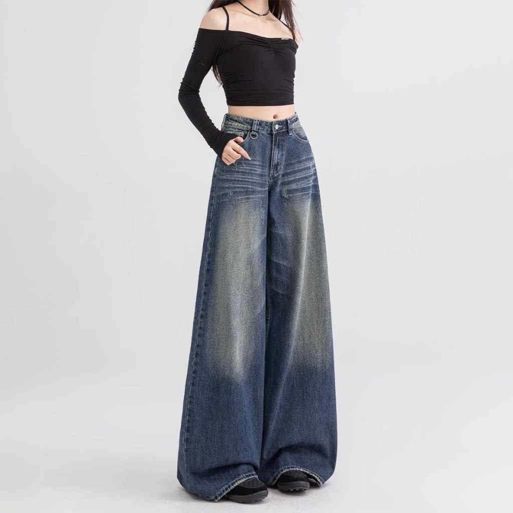 Biru Retro Highwaist Loose Celana Jeans Wanita Korea Style Lurus Celana Jeans Wanita Highwaist Denim Kekinian