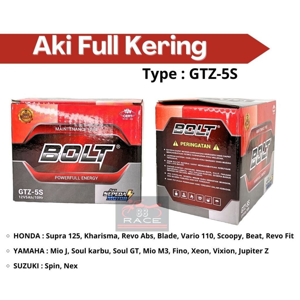 Aki Full Kering GTZ-5S 12V5Ah/10Hr Merk BOLT | Batrei motor kering gtz5s kharisma beat jupiter