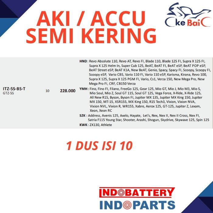 Indobattery Aki Motor ITZB5S / GTZ5S MERAH Semi Kering 3,5Ah 12V TITAN Asli Indoparts BeAt Vario Mio