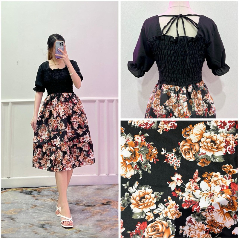 RD FASHION - JIWON DRESS COMBINASI / Gaun musim panas kasual baru Lengan pendek smocked dress lipit bunga dengan dasi belakang / gaun kasual A-line gaun smocked berlipat bunga lengan pendek
