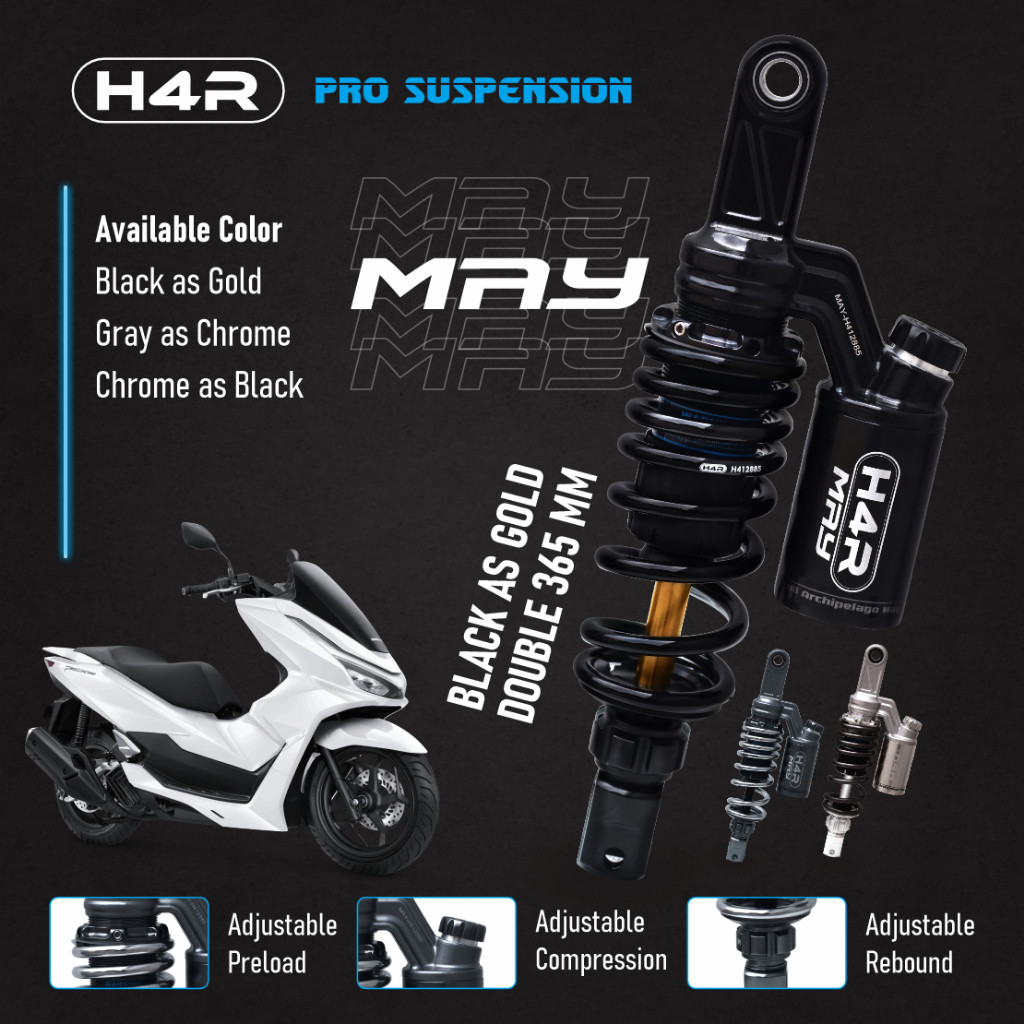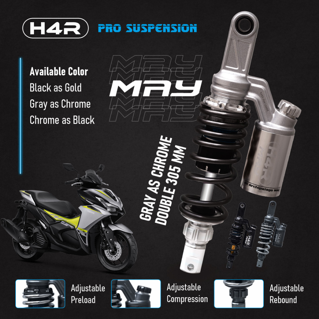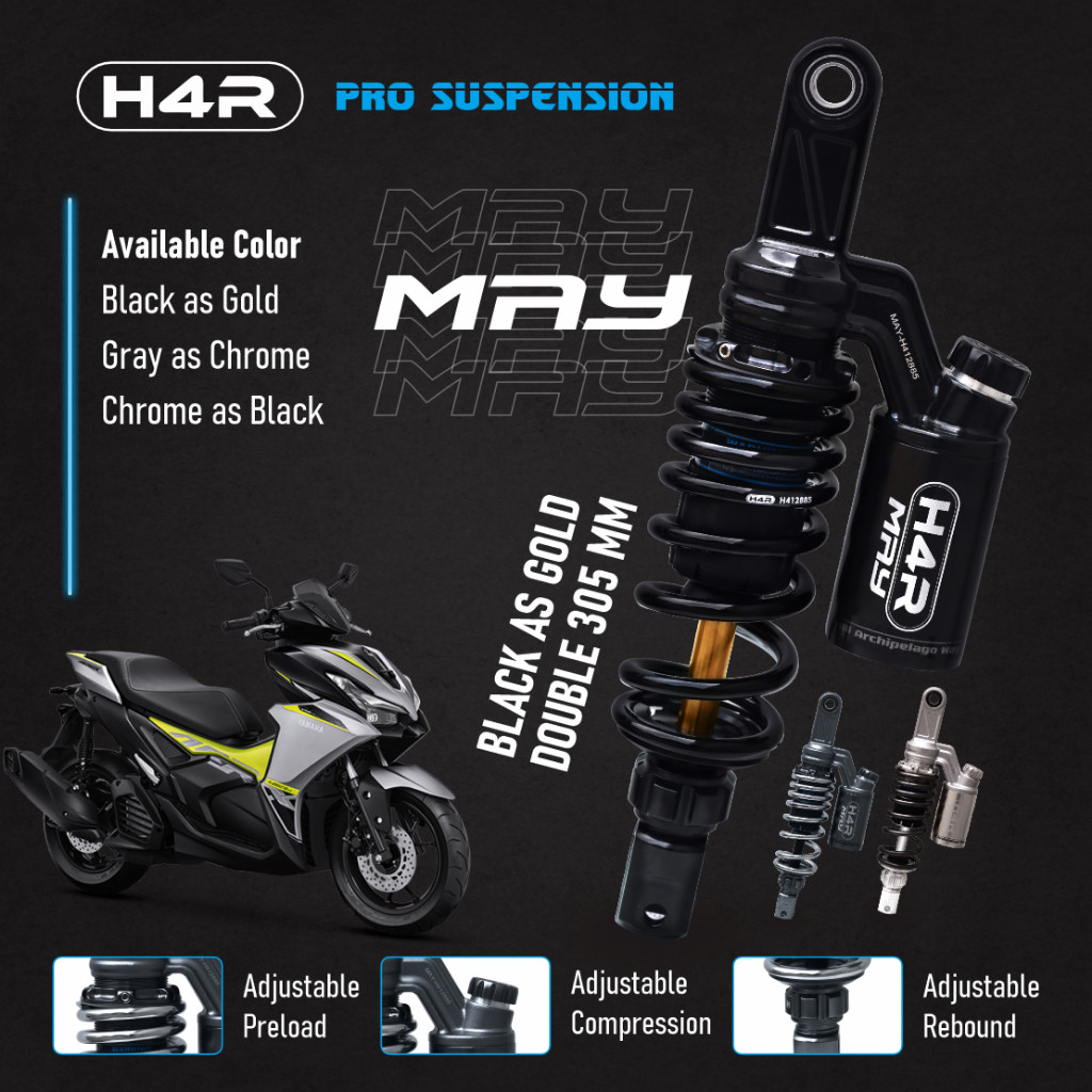 H4R SHOCK TABUNG ATAS MAY SERIES DOUBLE AEROX NMAX NEW OLD PCX 150 PCX 160 305MM 335M 365MM SHOCKBREAKER EVO PRELOAD ADJUSTABLE REBOUND CLICK AKTIF ORIGINAL HI-FORCE ORCA RACING