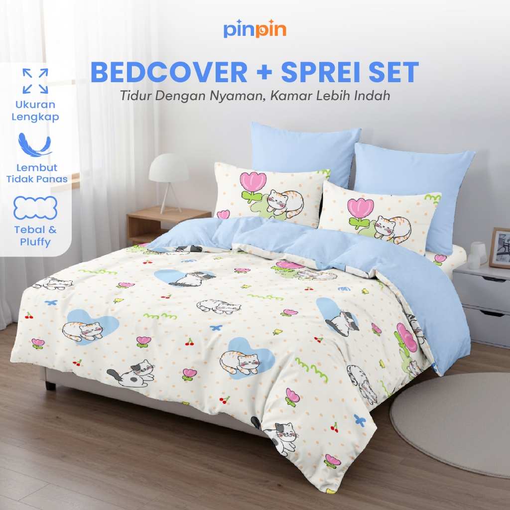 Bed Cover Set Sprei Cat Love Mix Pastel Blue Ukuran Lengkap - 180x200/160x200/200x200 - Pinpin Bedcover