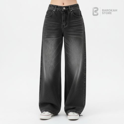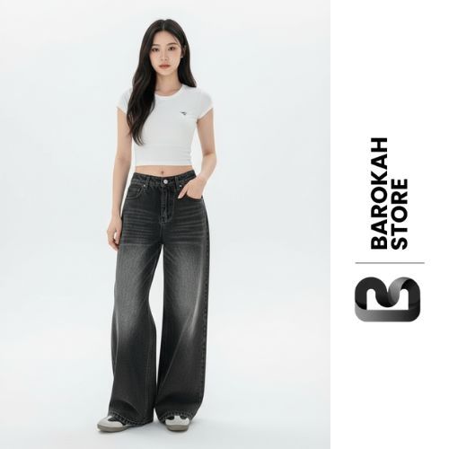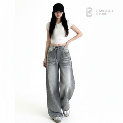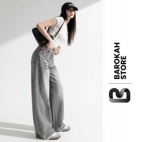 BRK-Celana jeans high waist wanita korean style Jeans baggy pants Serbaguna Kasual Biru Retro