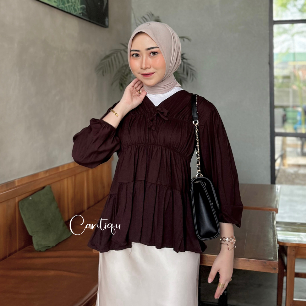 Cantiqu - Mireya Blouse Kerut Rayon Atasan Wanita Polos Warna Lengan Panjang
