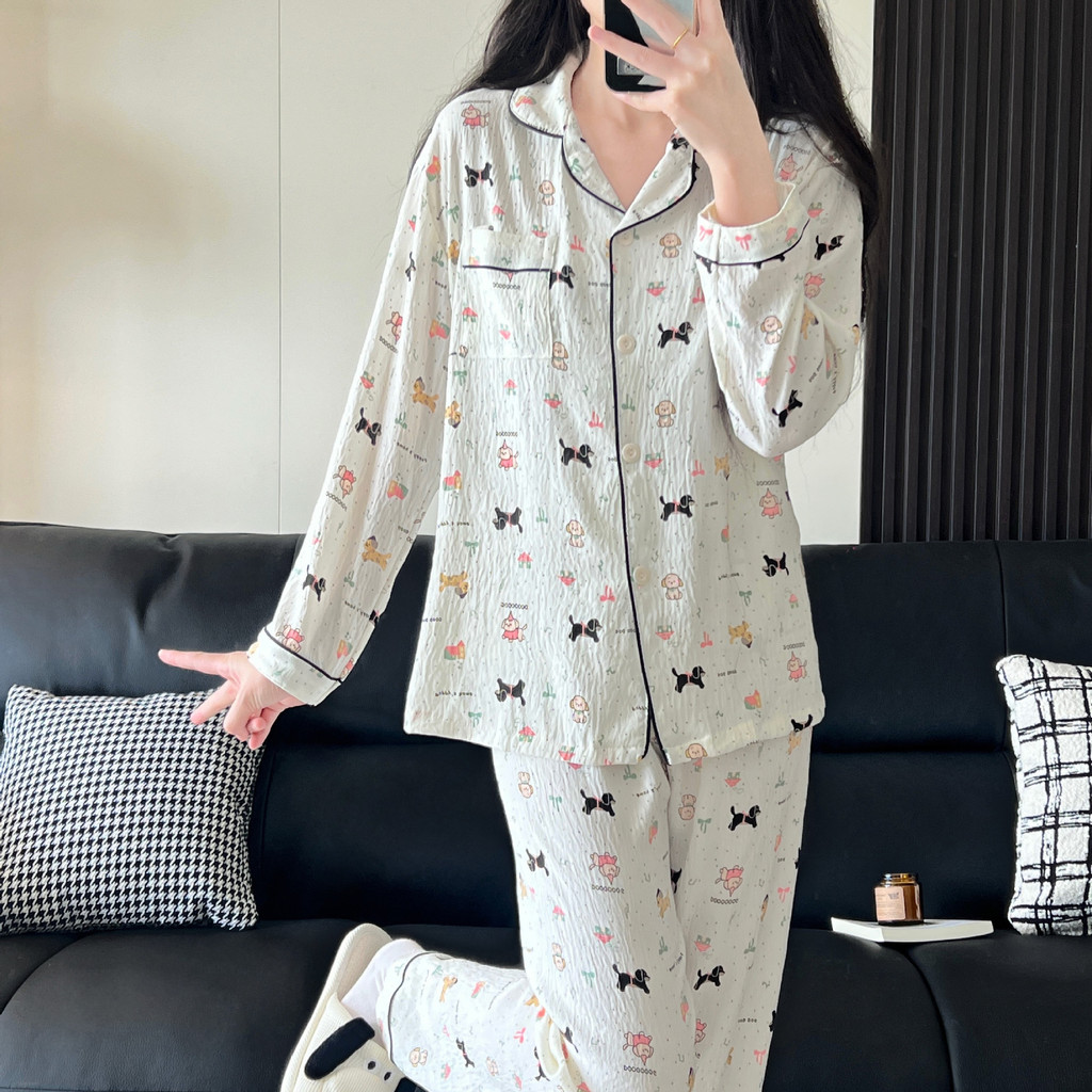 Baju Tidur Wanita Lengan panjang Celana panjang set baju tidur Lucu Motif kartun Santai Bernapas Baju rumah