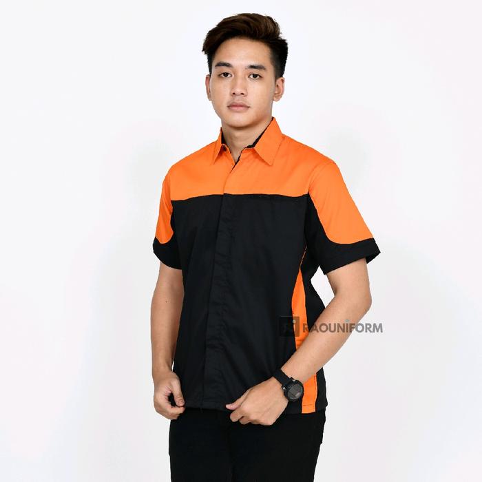 Raouniform Kemeja Kerja Pria Baju Atasan Kombinasi American Drill Lengan Pendek Seragam Kantoran