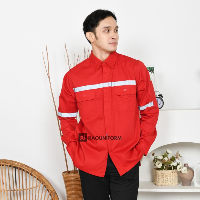 RAOUNIFORM Baju Safety Merah Cabe Lengan Panjang Seragam Pabrik Proyek Lapangan Ukuran S-4XL